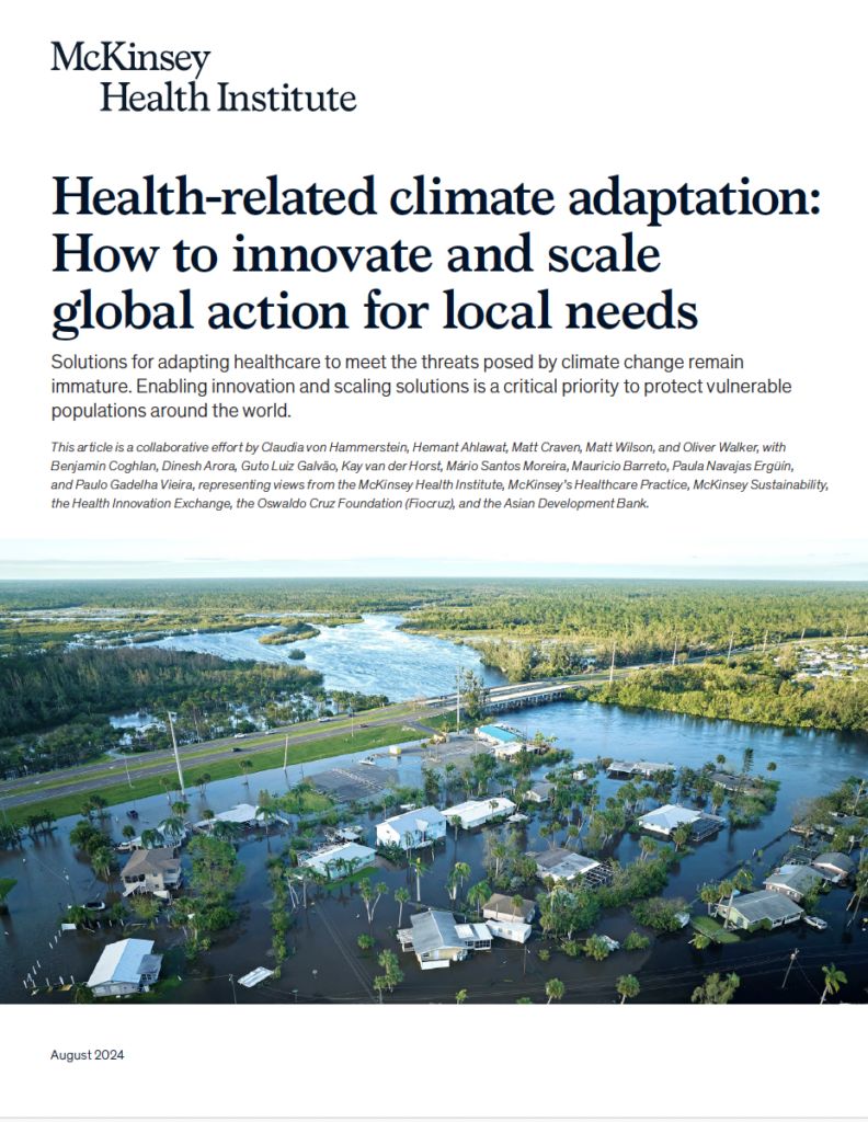 • The report highlights three areas of opportunity for innovation and the scaling of solutions that specifically target climate-related health challenges: 1) medical products and technologies that seek to reduce the burden of climate change on health; 2) health-related climate surveillance, early-warning, and response systems; and 3) climate-resilient healthcare infrastructure, supply chain, and workforce capabilities.